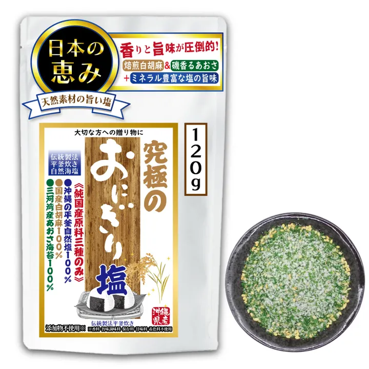 【純国産100%】《究極のおにぎり塩》<1>沖縄県産平釜海塩 <2>国産焙煎白ごま <3>三河湾産あおさ海苔 原料は純国産素材の3種類のみ◎ 完全無添加 うまみ調味料不使用 お子様にも◎ 香り+旨味にこだわり抜いた“優しいおにぎり専用塩”JAPANESE RICEBALL SALT onigiri「オリジナル配合」「1袋×120g入り」 12個