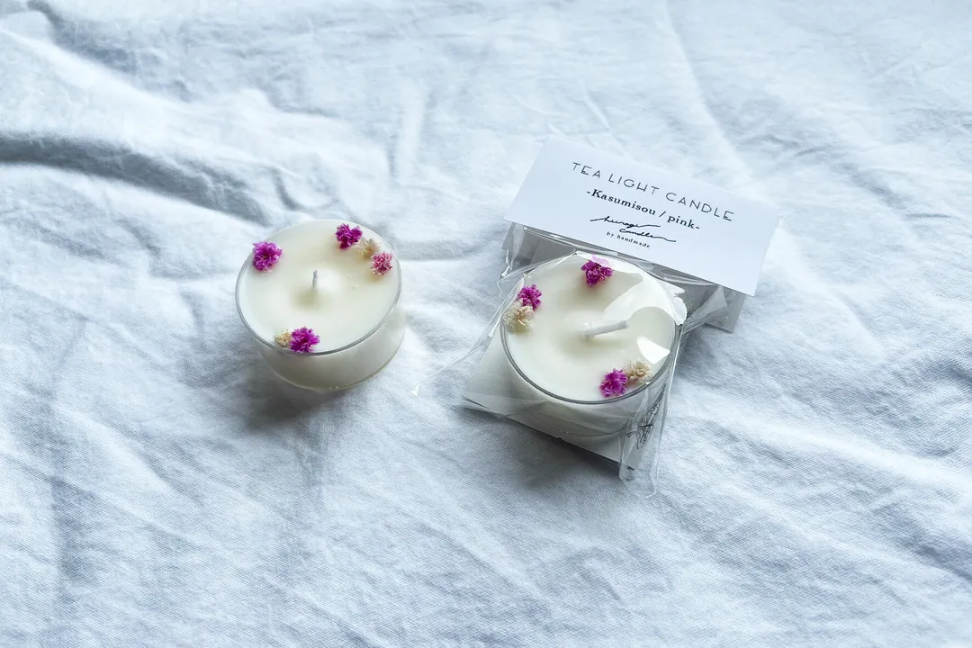 【アソートセット/7種から7つ選べる】こぼれ花のティーライトソイキャンドル<無香料> かすみ草(ピンク)と、無香料