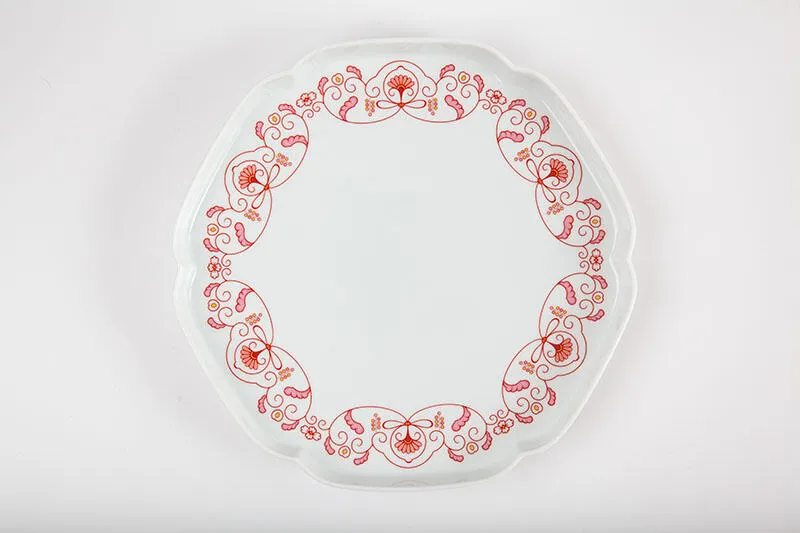 「ゆいからくさ」は鍋島様式に見られる縁を囲むように連続する唐草文様のエッセンスをとらえ、可憐にアレン ジした図案です。紐を結ったような様子から「ゆいからくさ」と名付けたこのシリーズでは、のびやかな唐草、 愛らしい花・実がデザイン化され、日本の伝統色である花浅葱、紅赤、金、白金の色違いで展開。幅広い食卓シー ンに華を添える文様です。 花形プレートは、すっきりとした絵柄が料理を引き立たせ、彩りを加えます。 内側は余白を多くとりながら、外側の立ち上がりに絵柄を入れることで、 どの角度から見ても美しい食卓になります。 24.5cmのサイズは一般的な食卓の1人分のスペースに収まり、立ち上がりがあることで、 汁気のあるお料理にも幅広く使えます。パスタ、ハンバーグ、パンケーキ、デザートプレートなどにおすすめです。