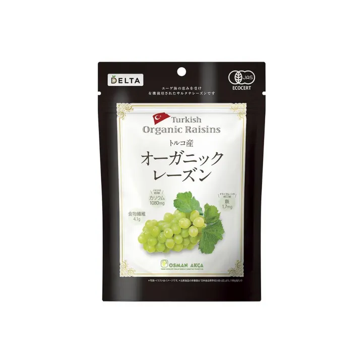 美しい色合いの果肉感豊かなオーガニックサルタナレーズン。 カリフォルニアレーズンなどと比べると天日干しの時間が少ないため、明るく美しい色合いで、柔らかさや果物の香りも優れているといわれています。ナチュラルな味わいでゴールデンレーズンとも呼ばれています。