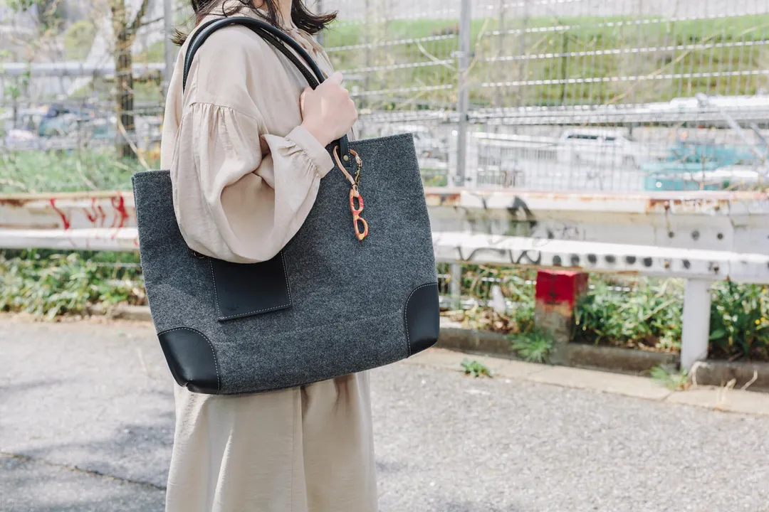 ――― 商品説明 ――― 抜群の収納力を兼ね備えながらも軽量の大きめトート ・A4大サイズのファイルが縦でも横でも入るサイズのオンオフ使い可能なトートバック。 ・特殊厚手の再生フェルト素材で、中身を守る機能性に加え、大きめのわりに軽量です。 ・スマホや電子カードの収納に便利な外側のポケットは取り外しが可能。 ・内側、外側ともに大きめサイズのファスナー付きポケットも配置しています。 ・持ち手や角部分など、強度の必要な箇所には本革を使用し、経年変化を味わえます。 ・フェルト生地は、あえてムラ感を出したスモーキーカラーとなる特殊製造オリジナル生地。 素材: 再生ポリエステル 本革 サイズ: 約W420×H320×D110㎜(持ち手:約550㎜) 重さ: 約530kg カラー展開: 7色 ――― お買い上げ前にお読みください ――― ・本革を使用している部分には、本革特有の多少の表情のムラや傷、手触りの違い等がありますが、天然本革の一般的な特長であり損傷ではありません。 また、日光や外気や使用時の手触り等により、経年変化を起こし、色が濃くなることがあります。 ・生地のフェルトの素材の性質上、摩擦により毛玉ができることがありますが、ハサミなどでカットしてください。