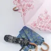 刺繍されたワイルドな大ぶりの花は山で見かけた花をイメージしました 綿に刺繍して傘の周囲のスカラップは大胆にカットワークしています 生地は国内で撥水防水・UV加工を施して晴雨兼用パラソルです ハンドルはブドウの木を使っていて自然な凸凹が手になじみます ベルト部分はゴムなので留めやすく機能的です