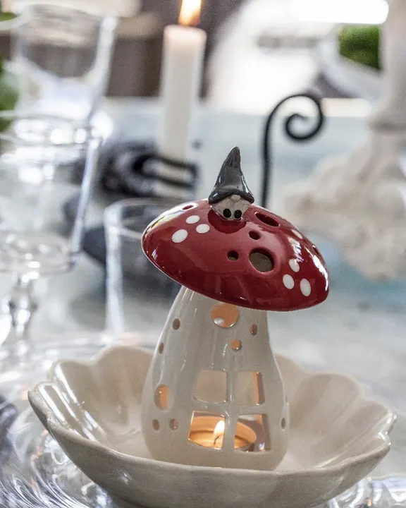 ストーリー : ヴェッテトムテはスウェーデンのとても小さな妖精です。時々お手伝いをしたりいたずらしたりするヴェッテトムテですが、このヴェッテトムテはとても優しいキャラクターで、きのこの上に座ってリラックスしています。 *キャンドルは付属していません。 サイズ : 14cm (高さ) 色:(主に)白&赤 材質:ポリレジン