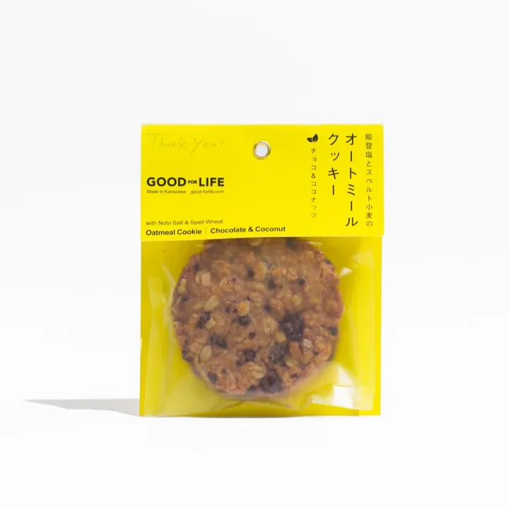 有機スペルト小麦と有機オートミールを使ったオートミールクッキーです。 生地に有機豆乳やメープルシロップを贅沢に使用しています。 地元石川県の能登の塩を使って、植物性素材のみでひとつひとつ手作りしています。 味は全2種類。 【チョコ&ココナッツ】 チョコレートはフェアトレードの有機ダークチョコを使用しています。 ビターチョコとまろやかなココナッツの甘さが特徴です。 栄養成分表示 :1袋35g当たり(推定値) 熱量184kcal,タンパク質2.8g,脂質10.2g,炭水化物20.8g,食塩相当量0.1g 【ペッパー&カシューナッツ】 オートミールクッキー人気ナンバー1! カシューナッツのまろやかな甘さと、ブラックペッパーがピリッと効いたクッキーです。 甘いものが苦手な方やお酒のおつまみにも! 栄養成分表示 1袋35g当たり(推定値) 熱量176.7kcal,タンパク質3.0g,脂質9.2g,炭水化物20.8g,食塩相当量0.4g 【有機スペルト小麦って?】 使っているのは品種改良されていない古代小麦。 一般的な小麦よりも「消化のしやすさ・良質なたんぱく質の含有量・アレルギー発症のしづらさ・化学肥料なしでの生育」といった点で優れています。 グルテン含有量が低く、グルテンを気にする人も食べやすいです。 使用食材を気にせず、迷わず選べて、みんなで楽しく食べられるおかしを展開しています。 【ひとつひとつのお菓子に「ありがとう」の気持ちを込めて】 私たちは、「身体にも、環境にも、やさしく。」という思いを大切に、城下町金沢で能登のお塩を使った、植物性素材のやさしいおやつを作っています。 厳選した素材を使用し、卵・バター等をはじめとする乳製品・添加物には頼らない素材本来の「おいしさ」にこだわった、オーガニック由来のフードをご提案・お届けしています。 GOODFORLIFEのおやつで、ほっと一息つく時間が、より癒されるものになりますように。 ※写真はイメージです。デザインは予告なく変更する場合がございます。