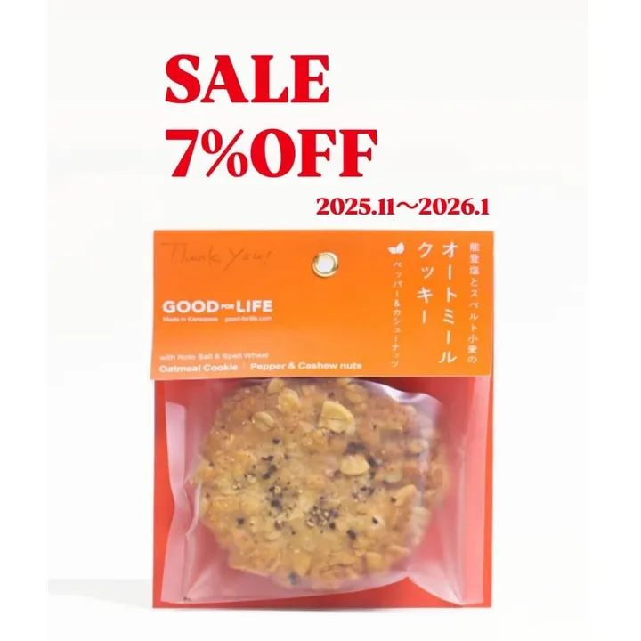 期間限定SALE!! 掛け率7%OFF開催中(2025.11~2026.1) 通常掛け率68%のところ、61%でご注文いただけます! ※賞味期限は2026.2.2以降のものをお届けいたします 有機スペルト小麦と有機オートミールを使ったオートミールクッキーです。 生地に有機豆乳やメープルシロップを贅沢に使用しています。 地元石川県の能登の塩を使って、植物性素材のみでひとつひとつ手作りしています。 味は全2種類。 【チョコ&ココナッツ】 チョコレートはフェアトレードの有機ダークチョコを使用しています。 ビターチョコとまろやかなココナッツの甘さが特徴です。 栄養成分表示 :1袋35g当たり(推定値) 熱量184kcal,タンパク質2.8g,脂質10.2g,炭水化物20.8g,食塩相当量0.1g 【ペッパー&カシューナッツ】 オートミールクッキー人気ナンバー1! カシューナッツのまろやかな甘さと、ブラックペッパーがピリッと効いたクッキーです。 甘いものが苦手な方やお酒のおつまみにも! 栄養成分表示 1袋35g当たり(推定値) 熱量176.7kcal,タンパク質3.0g,脂質9.2g,炭水化物20.8g,食塩相当量0.4g 【有機スペルト小麦って?】 使っているのは品種改良されていない古代小麦。 一般的な小麦よりも「消化のしやすさ・良質なたんぱく質の含有量・アレルギー発症のしづらさ・化学肥料なしでの生育」といった点で優れています。 グルテン含有量が低く、グルテンを気にする人も食べやすいです。 使用食材を気にせず、迷わず選べて、みんなで楽しく食べられるおかしを展開しています。 【ひとつひとつのお菓子に「ありがとう」の気持ちを込めて】 私たちは、「身体にも、環境にも、やさしく。」という思いを大切に、城下町金沢で能登のお塩を使った、植物性素材のやさしいおやつを作っています。 厳選した素材を使用し、卵・バター等をはじめとする乳製品・添加物には頼らない素材本来の「おいしさ」にこだわった、オーガニック由来のフードをご提案・お届けしています。 GOODFORLIFEのおやつで、ほっと一息つく時間が、より癒されるものになりますように。 ※写真はイメージです。デザインは予告なく変更する場合がございます。