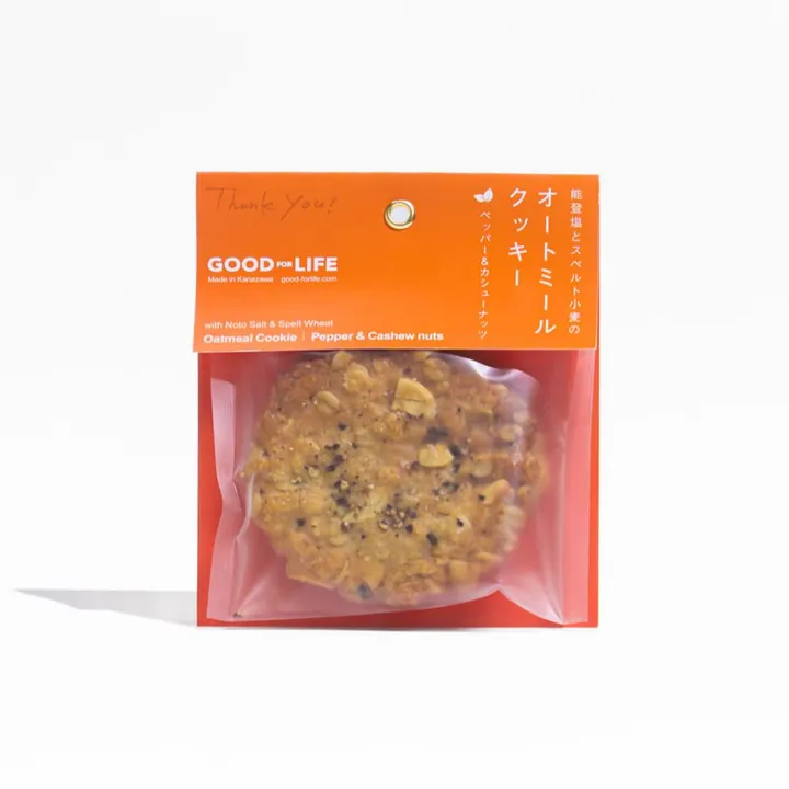 有機スペルト小麦と有機オートミールを使ったオートミールクッキーです。 生地に有機豆乳やメープルシロップを贅沢に使用しています。 地元石川県の能登の塩を使って、植物性素材のみでひとつひとつ手作りしています。 味は全2種類。 【チョコ&ココナッツ】 チョコレートはフェアトレードの有機ダークチョコを使用しています。 ビターチョコとまろやかなココナッツの甘さが特徴です。 栄養成分表示 :1袋35g当たり(推定値) 熱量184kcal,タンパク質2.8g,脂質10.2g,炭水化物20.8g,食塩相当量0.1g 【ペッパー&カシューナッツ】 オートミールクッキー人気ナンバー1! カシューナッツのまろやかな甘さと、ブラックペッパーがピリッと効いたクッキーです。 甘いものが苦手な方やお酒のおつまみにも! 栄養成分表示 1袋35g当たり(推定値) 熱量176.7kcal,タンパク質3.0g,脂質9.2g,炭水化物20.8g,食塩相当量0.4g 【有機スペルト小麦って?】 使っているのは品種改良されていない古代小麦。 一般的な小麦よりも「消化のしやすさ・良質なたんぱく質の含有量・アレルギー発症のしづらさ・化学肥料なしでの生育」といった点で優れています。 グルテン含有量が低く、グルテンを気にする人も食べやすいです。 使用食材を気にせず、迷わず選べて、みんなで楽しく食べられるおかしを展開しています。 【ひとつひとつのお菓子に「ありがとう」の気持ちを込めて】 私たちは、「身体にも、環境にも、やさしく。」という思いを大切に、城下町金沢で能登のお塩を使った、植物性素材のやさしいおやつを作っています。 厳選した素材を使用し、卵・バター等をはじめとする乳製品・添加物には頼らない素材本来の「おいしさ」にこだわった、オーガニック由来のフードをご提案・お届けしています。 GOODFORLIFEのおやつで、ほっと一息つく時間が、より癒されるものになりますように。 ※写真はイメージです。デザインは予告なく変更する場合がございます。