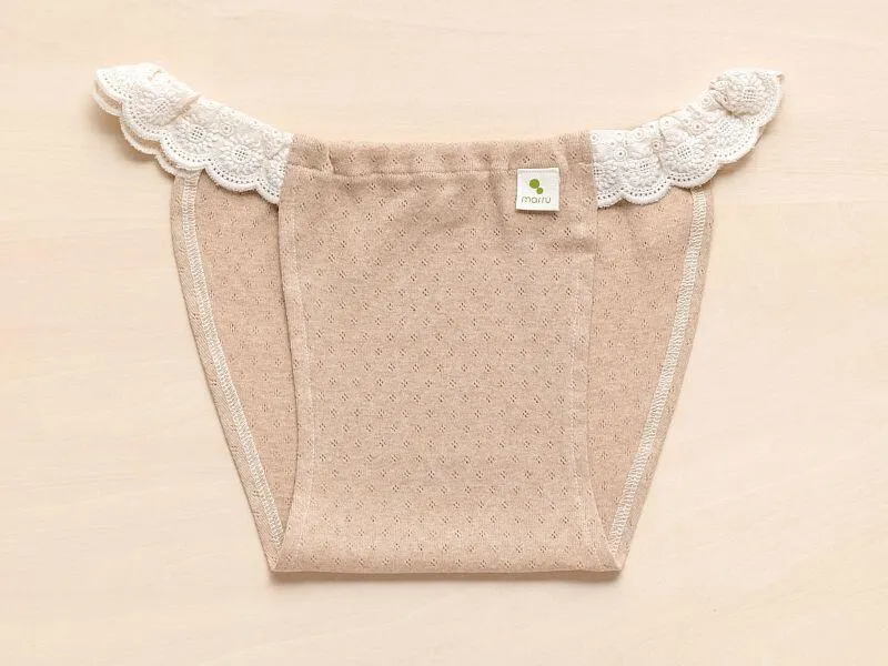 ※サンプル商品につき、パッケージに入れずにお渡しします。 マアル一番の人気者「新月ショーツ」 足の付け根やお腹を締めつけないデザインと、愛らしいレースが特徴。 2010年の創業以来、多くの方に愛され続けています。 こちらの新月ショーツは、無染色のオーガニックコットン「茶綿」を使用しています。 生成りと比べると、茶綿はさらっとした感触。 無農薬有機栽培で育てた綿を、極力化学物質を使わず、漂白も染めも一切せずに、国内で丁寧に編んだ生地です。 オリジナルのエンブロイダリーレースは栃木県の工場で特別に作られており、縫い糸も含め、すべてオーガニックコットン糸で作っています。 一般的な下着は、伸縮性があり廉価な化学繊維の糸で縫いますが、肌が繊細な方は化繊糸に痒みを感じることが多いため、 独自の方法で1着1着、オーガニックコットン糸を使い国内の縫製工場で縫っています。 綿の栽培から糸づくりまで、世界的なソーシャルプロジェクト=bioRe PROJECT が担っており、 気持ちがいい!と感じた肌着が、どこまで遡ってもマアルく気持ちのいいフェアトレードの関係で生まれたものであるようにと願っています。 一度身につけると手放せなくなる快適さ。 マアルのショーツは股上がかなり浅めです。 これは、ゴム部を骨盤輪の上に乗せることで、腸を締め付けないようにするためです。 だから、お腹の大きな妊婦さんでも履き続けることができます。 また、浅ばきであるため、一見冷えそうに見えますが、 足の付け根(鼠蹊部)やお腹周りを締め付けないことで、 体温の上昇作用も大学との共同調査で明らかになりました。 品質表示ラベルは、あえて外側に。 取り外しやすいよう、大きめのミシン目で本体の縫い目とは別に取り付けてあります。 これも、肌刺激を減らす工夫です。 また、ゴム交換口を用意してあります(左前のブランドタグの内側あたり)。 お好みの緩め具合に調整したり、太った、痩せた、妊娠したなどといった体の変化にも対応できます。 サイズ:S(W58~64cm H82~90cm)     M(W64~70cm H87~95cm)     L(W69~77cm H92~100cm)     LL(W77~85cm H102~110cm)     (W:ウエスト H:ヒップ)