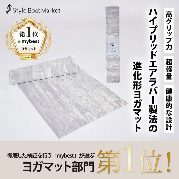 日本最大級の比較検証サイト「mybest」ヨガマット部門 NO.1 健康と環境を考えた日本技術が生んだヨガマット 特徴1「EVA×ゴムのハイブリット」 EVA素材(エチレン酢酸ビニールコポリマ)×ゴムのハイブリット素材。EVA素材はPVC素材(ポリ塩化ビニル)やTPE素材よりも強度が強く、水にも強く軽量。また燃やしても有害物質を出さない環境を配慮した万能素材。このEVAにさらにゴムをブレンドしEVAをより進化させ耐久性、クッション性、柔軟性を向上させた素材。 特徴2「日本が世界に生み出したエアラバーの進化版」 長らく歩行専用ラバーとして開発して長年人々の足元を支え続けるbuntaro(1948年創業70年のインソール素材メーカー)が開発した「エアラバーシリーズ」の中でも最も強く、柔軟性がある素材をさらにヨガマット用に進化。人体を優しく包み込むような体感と滑らかさを感じる素材に。また名前の通り気泡が多く空気のように超軽量。この技術は日本の神戸で誕生し、世界的に見ても未だ再現されていない日本の技術が詰まった素材。 特徴3「低反発×高反発」 低反発×高反発という通常ではあり得ない相反する二つの特徴を持つ素材。マットを踏むときは「低反発」マットから離れる時は「高反発」でマットでの運動時に体の動きをしっかりサポートしてくれる。 特徴4 「水を浸透させない衛生的な素材」 マット最大の特徴、一つ一つが独立した気泡で構成されているため、水の浸透を防ぎカビなどの細菌も繁殖しない衛生面に優れた素材。また水の浸透を防ぎつつ細かい表面の気泡で汗などでの滑りも最小限に抑えることができる万能素材。 特徴5「お餅のような肌触りと高グリップ力」 数多くの表面の細かい気泡とゴムのブレンドにより、よくあるヨガマットに滑り止めのための凹凸が一切なく、「お餅」のような心地よい肌触りと細かい気泡が多面的にあるため摩擦面が多く高グリップ力を実現。ハードなポーズも万能なグリップ力でサポート 特徴6「体の機能をリカバリー」 このマットの開発には理学療法士も関わり、人の足の使い方に着目した素材開発。マットのグリップと低反発の調整により、人間が「踏み込み」のためによく使用する足趾(足の指)を自然と働かせるように設計。現代人が失われつつある足の指の動きは実はとても重要で、使わなくなることで縦アーチの低下、外反母趾などに繋がり歩行障害になる恐れがあります。また足趾を使用することで疲労感を回復したり、血流を改善することができ体全体の健康バランスを整えてくれます。最大の特徴はマットの使用を継続することで失われつつある足趾の運動を身体認知し、ヨガやその他の自動運動の精度を向上させながら、体全体をリカバリーして継続的に体全体を健康な状態してくれます。 特徴7「ものを循環させるアップサイクル」 ものを無駄に捨てない取り組みとして使用しなくなったマットを回収し、細かく粉砕しクッションなどのビーズ に生まれ変わる取り組みや、粉砕した資源を硬く固め板状にして椅子や棚などに使用できる新しい資材に活用していきます。 ※こちらの商品はヨガマット以外の用途ではご使用をお控えください。 ※ご使用後、汚れなどが気になる場合には、水拭きでお手入れをお願いします。お手入れをされた後は、風通しの良いところで保管をお願いいたします。 また、マットが完全に乾いたことを確認しましたら筒状に丸めて保管されることをおすすめいたします。