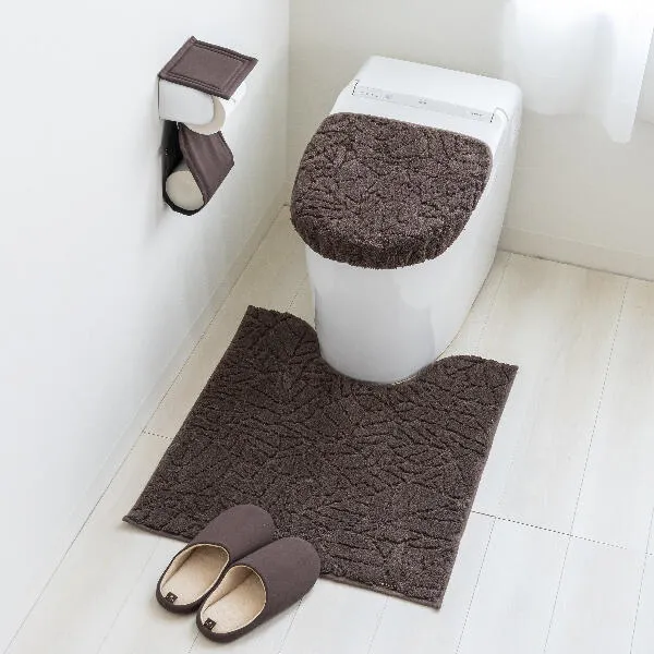 家の中で一番清潔にしたい場所はトイレという人は多いと思いますが、その一方で一番清潔を保ちにくいのもトイレです。 プリスベイスウィルトイレタリーはトイレをクリーンな空間にすることを考えたトイレタリーです。 消臭するトイレマットとフタカバー、洗浄暖房専用ロングフタカバー トイレマットとフタカバー、洗浄暖房専用ロングフタカバーには東レの消臭繊維「アデリカ」を使用しました。アンモニア、酢酸、イソ吉草酸 などの悪臭を二時間後には95%まで消臭します。また、繊維そのものに消臭効果があるので、お洗濯や日光にあてることで効果が復活 し、洗濯で剥がれ落ちることはありません。 リーフ柄のような、幾何柄のようなデザインと上質な質感 ハイカット、ミドルループで構成された柄は、夏の日の生命力にあふれた木々に生い茂るリーフをもとにデザインしました。幾何柄にも見 えるモダンなデザインです。糸を詰めて織り、パターンをくっきり出すことにこだわりました。上質なしっかりとしたマットに仕上がっています。 リッチなカラー カラーは3色。それぞれ1枚のマットに2色の糸を使って織りました。グリーン×ブルー、グレー×グレイッシュピンク、ブラウン×チャコール グレーの組み合わせで、思いがけない組み合わせがリッチな色合いと奥行きを出しています。