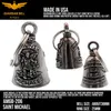 アメリカ製ガーディアンベル社製ガーディアンベルです。 MADE IN USA アメリカ製 交通安全 魔除け 御守り ガーディアンベル アメリカのライダーの間には、事故や、転倒の原因は「道路にひそむ悪魔」によるいたずらだという伝説があります。悪魔は走る者に悪戯やトラブルを運んできます。このベルは美しい音色で悪魔たちを追い払うと言われ愛されています。そんな悪魔のいたずらを防ぎ、御守りとなるのが、守護者のベルという意味を持つガーディアンベル。 日本でも鈴の音(ね)は神道では魔除けの音と言われています。ピューター製の鈴でいい音色でガーディアンベルはデザインも様々あります。 またガーディアンベルにまつわる伝説として、プレゼントとして送られたベルの効果は、自分で手に入れたものの2倍になると言われています。 それゆえに彼氏・彼女・友達・家族へのプレゼントとしての人気も非常に高まっています。 シルバーアクセサリーのようにおしゃれに装着できて素敵な音色を奏でるガーディアンベル。 バイカー以外にも自転車や旅・交通安全のお守りとしてお使いいただけます。 カバン・ランドセル・キーホルダー・ペットの首輪等に付けてお使いください!! ※タイラップ等でバイクのフレームにも簡単に取り付けできます。 アメリカンモデルだけではなく、旧車ファン、レプリカライダーまで、さらにバイクだけでなく、自転車や車にもピッタリな御守りとなっています。 アクセサリーとしても人気で、アイディア次第で車体だけでなく、キーホルダーや鞄など、どこにでも付けておしゃれに楽しめます。