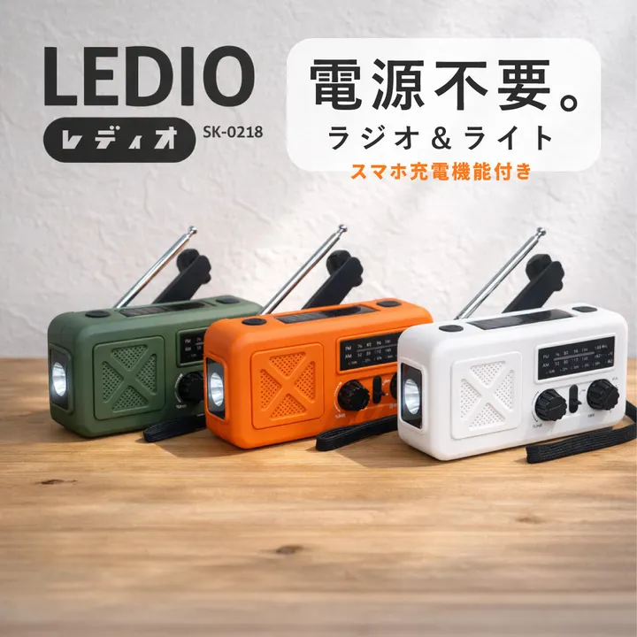 【電源不要のスマホ充電機能付きラジオ&LEDライト】 ラジオ・LEDライト・スマホ充電を この一台に集約した多機能ラジオライト 「LEDIO(レディオ)」 停電時も、アウトドアでも。 電池が切れても自家発電でき、 必要な情報と光を手元に届けます。 ━━━━━━━━━━━━━━ ■ LEDIOの特長 ━━━━━━━━━━━━━━ 【AM / FMラジオ (ワイドFM対応)】 音量ツマミで電源ON。 チューナーツマミで簡単チューニング。 災害時の情報収集から日常使いまで対応。 ワイドFM対応ですので、AMを受信しにくい場所でもAM放送を受信可能です。 【500ルーメン LEDライト】 本体側面に高輝度LEDを搭載。 MAX 500lmの明るさは、電源を消費しすぎず、暗すぎない絶妙な設計です。 強・弱の2段階切替で、停電時や夜間作業、アウトドアでも活躍。 【3WAY充電方式】 1. USB充電(約4時間 ※環境による) 2. ソーラーパネル充電(太陽光1時間 約60mAh) 3. 手回しダイナモ発電 バッテリー切れでも、手回し約2分(130~140回/分)でラジオまたはLEDライトを約10分使用可能。 【SOSアラーム機能】 SOSボタン長押しで、アラーム音+点滅ライトが作動。 緊急時に周囲へ異変を知らせます。 【電池残量表示】 25% / 50% / 75% / 100% ランプ表示で残量が一目で確認可能。 【安心設計】 ・IPX3相当の生活防滴(※豪雨・水没不可) ・軽量で丈夫なABS樹脂ボディ ・手首に通せる長めのストラップ付き。リュックなどにも。 ━━━━━━━━━━━━━━ ■ カラー ━━━━━━━━━━━━━━ 選べる全3カラー ※詳細は商品画像をご確認ください。 ━━━━━━━━━━━━━━ ■ 仕様 ━━━━━━━━━━━━━━ サイズ 全長13.8cm/幅5.6cm/高さ6.9cm 重量 約280g 材質 ABS樹脂 付属品 ストラップ、Type-C USBケーブル、取扱説明書 ━━━━━━━━━━━━━━ ■ こんな方におすすめ ━━━━━━━━━━━━━━ ・防災用に「本当に使える」ラジオを探している方 ・停電時の情報・光・充電を一台で備えたい方 ・アウトドアやハイキング、キャンプ用に ・備蓄や贈り物として安心できる製品を選びたい方 ━━━━━━━━━━━━━━ ■ ご注意 ━━━━━━━━━━━━━━ 画面表示と実物では、色味が多少異なる場合があります。 あらかじめご了承ください。
