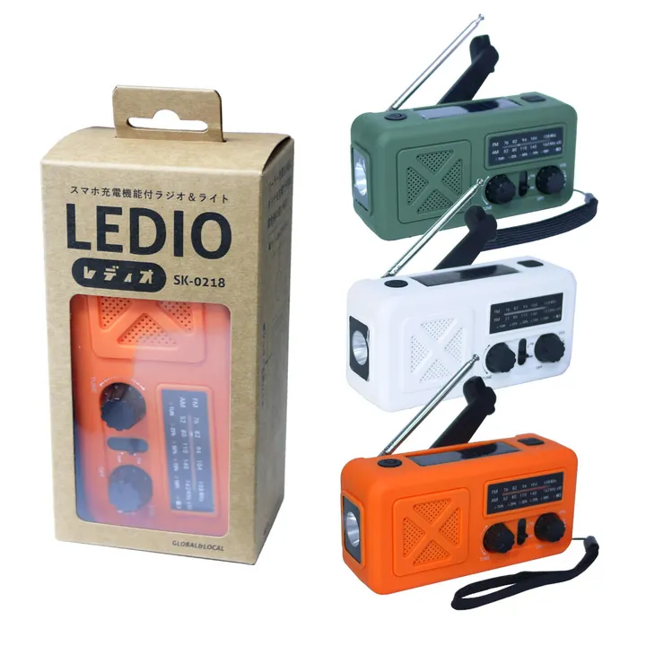 【電源不要のスマホ充電機能付きラジオ&LEDライト】 ラジオ・LEDライト・スマホ充電を この一台に集約した多機能ラジオライト 「LEDIO(レディオ)」 停電時も、アウトドアでも。 電池が切れても自家発電でき、 必要な情報と光を手元に届けます。 ━━━━━━━━━━━━━━ ■ LEDIOの特長 ━━━━━━━━━━━━━━ 【AM / FMラジオ (ワイドFM対応)】 音量ツマミで電源ON。 チューナーツマミで簡単チューニング。 災害時の情報収集から日常使いまで対応。 ワイドFM対応ですので、AMを受信しにくい場所でもAM放送を受信可能です。 【500ルーメン LEDライト】 本体側面に高輝度LEDを搭載。 MAX 500lmの明るさは、電源を消費しすぎず、暗すぎない絶妙な設計です。 強・弱の2段階切替で、停電時や夜間作業、アウトドアでも活躍。 【3WAY充電方式】 1. USB充電(約4時間 ※環境による) 2. ソーラーパネル充電(太陽光1時間 約60mAh) 3. 手回しダイナモ発電 バッテリー切れでも、手回し約2分(130~140回/分)でラジオまたはLEDライトを約10分使用可能。 【SOSアラーム機能】 SOSボタン長押しで、アラーム音+点滅ライトが作動。 緊急時に周囲へ異変を知らせます。 【電池残量表示】 25% / 50% / 75% / 100% ランプ表示で残量が一目で確認可能。 【安心設計】 ・IPX3相当の生活防滴(※豪雨・水没不可) ・軽量で丈夫なABS樹脂ボディ ・手首に通せる長めのストラップ付き。リュックなどにも。 ━━━━━━━━━━━━━━ ■ カラー ━━━━━━━━━━━━━━ 選べる全3カラー ※詳細は商品画像をご確認ください。 ━━━━━━━━━━━━━━ ■ 仕様 ━━━━━━━━━━━━━━ サイズ 全長13.8cm/幅5.6cm/高さ6.9cm 重量 約280g 材質 ABS樹脂 付属品 ストラップ、Type-C USBケーブル、取扱説明書 ━━━━━━━━━━━━━━ ■ こんな方におすすめ ━━━━━━━━━━━━━━ ・防災用に「本当に使える」ラジオを探している方 ・停電時の情報・光・充電を一台で備えたい方 ・アウトドアやハイキング、キャンプ用に ・備蓄や贈り物として安心できる製品を選びたい方 ━━━━━━━━━━━━━━ ■ ご注意 ━━━━━━━━━━━━━━ 画面表示と実物では、色味が多少異なる場合があります。 あらかじめご了承ください。