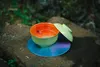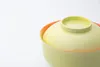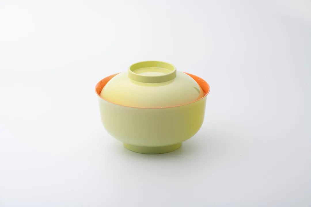 山中温泉の景勝地:鶴仙渓をモチーフにした蓋付の大きめのお椀。外側は癒しの黄緑グラデーション、内側は緑に川床にかかる傘の赤を加えた変わり塗です。内外の対照的な色彩で「侘び寂び」を感じることができます。蓋は皿としても使え、お椀は麺類やお雑煮の椀やアイスクリームも入れるデザートしても良いです。食洗器、電子レンジ対応のプラスチック素地に職人が一つ一つ吹付塗装で塗り重ねられ、蓋を開けると鮮やかな色彩が広がります。