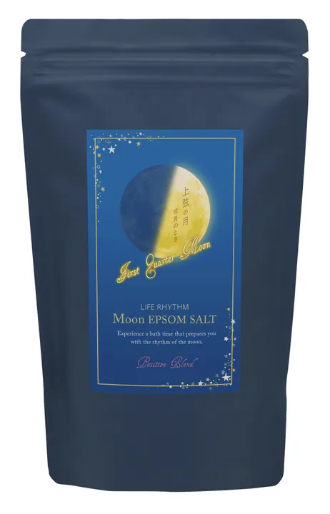 「ムーンエプソムソルト」は、月のリズムをイメージした天然精油のブレンドオイルで香りをつけたエプソムソルト。 自然の力を素直に感じて欲しいから、着色料も保存料も、何も加えていません。 精油の自然な香りと、ミネラルを含んだエプソムソルトが包み込むようにサポートします。 【湯色】透明 ・新月の香り 【香り】フォーカスブレンド…清涼感漂うスッキリ系の香り 【ブレンド精油】ローズマリー葉油・ラベンダー油・ユーカリ葉油・ハッカ葉油・アトラスシーダー木油・セイヨウアカマツ葉油・ セイヨウハッカ油・コウスイガヤ油 ・上弦の月の香り 【香り】ポジティブブレンド…甘く華やかなフローラル系の香り 【ブレンド精油】ニオイテンジクアオイ油・ラベンダー油・ベルガモット果実油・パルマローザ油・オレンジ油・エンピツビャクシン油・チョウジ葉油 ・満月の香り 【香り】カームブレンド…フレッシュで甘酸っぱいシトラス系の香り 【ブレンド精油】ラベンダー油・オレンジ油・ベルガモット果実油・イランイラン花油・オニサルビア油・ローマカミツレ花油 ・下弦の月の香り 【香り】リリースブレンド…ハーバルでウッディな森林系の香り 【ブレンド精油】ヒノキ油・ユーカリ葉油・ラバンデュラハイブリダ油・ラベンダー油・セイヨウネズ果実油・レモン果皮油・スペアミント油・イタリアイトスギ葉/実/茎油・ベルガモット果実油 ※香りはイメージです 〈使用方法〉浴槽のお湯(約200L)に本品100gを入れ、よくかき混ぜて、完全に溶かしてからご入浴ください。 付属のスプーンすりきり2杯半(約100g)が1回分の目安です。 ※中に計量スプーンが入っています。