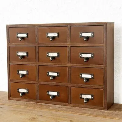 北海道 旭川市の自社工場で製作しています 大人気のミニチェスト。 アンティーク風の金具がアクセント。 ちょっとした小物の収納にピッタリ。 引き出しが12個もあり、取っ手金具にラベル入れがついているので細かいパーツなどの分類にも便利。 文具や手芸用品など、お道具箱として使い勝手が良い。 ■商品サイズ 約 横幅450×奥行110×高さ334mm 引き出し内寸 約 横幅112×奥行82×深さ55mm (板の厚みなどで、多少の誤差が出る場合があります) ■材質 合板を使用。 木目、色合いなどが1つ1つ違います。