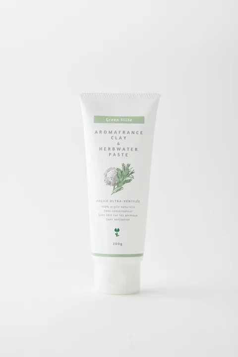 アロマフランスのグリーンイライト*とローズマリーハーブウォーター(ローズマリー葉水/収斂剤)を独自のレシピでブレンドし、使いやすいクレイペーストを作りました。 パウダー状のクレイから作るクレイペーストに近いテクスチャーを再現し、クレイの力を余すことなく感じていただけます。 クレイの優れた吸収・吸着力がお肌の汚れや老廃物、古い角質層を取り除き、香り豊かなローズマリーのハーブウォーターがお肌を引き締めます。 多くの方に心地よくお使いいただけるように、100%天然由来原料を使用しております。 *イライト・カオリン・モンモリロナイト(汚れ吸着成分) 《原料へのこだわり》 ◎クレイ:グリーンイライト(イライト・カオリン・モンモリロナイト) 高純度のナチュラル100%クレイがお肌の汚れを取り除きます。 クレイが採掘される鉱山は、フランスのシェヌ・デ・ピュイ火山群にあるサン・ポリアン村にあります。環境汚染から守られ、太陽の光をたくさん浴びる南向きに面します。 クレイの純度が非常に高く、お肌の汚れへの【吸収】【吸着】というクレイの働きが効率よく行われます。 製品の皮膚科学テストの被検は人体のみで、動物実験は一切しておりません。 防腐剤や保存剤を使用しておらず、放射線処理などの化学的な工程を経ておりません。 自然と生物にやさしいクレイです。 ◎ハーブウォーター:ローズマリー葉水(はすい) お肌を引き締めます。 南フランス・レイヤンヌ郡の蒸留家ロズリーヌさんは、野生のローズマリーを手作業で収穫し、低温・低圧力の蒸留方法で植物に負担をかけ過ぎないようにしています。 蒸留をする植物1キロに対して、はじめの1リットル分だけを抽出するので、濃縮された香り豊かなハーブウォーターになります。 蒸留後の植物を乾燥させ、蒸留釜を炊く燃料として使用します。植物を最後まで使いきることは自然に対する敬意です。 《使用方法》 ◆パックとしてご使用の場合 ①洗顔後、タオルドライしたお肌に厚めに伸ばします。端まで均一に塗るのがポイントです。 ②そのままの状態で15分程おいてください。 ③マッサージするようにやさしく洗顔し、充分にすすぎます。必要に応じて、化粧水などで整えます。 ◆洗顔としてご使用の場合 ①あらかじめ顔と手をぬらしておきます。手のひらに3センチ程取りだし、両手にひろげてから、お顔全体になじませます。 ②マッサージするようにやさしく洗顔し、充分にすすぎます。必要に応じて、化粧水などで整えます。 《アロマフランス 創業者 前原ドミニックからのメッセージ》 こんにちは、アロマフランスの前原ドミニックです。 『クレイのある日常』を目指してクレイテラピーのご紹介とスクールを運営してきました。 新商品としてクレイとハーブウォーターをブレンドしたクレイペーストを使うことによりクレイも身近に感じていただける機会が増えることを願っております。 クレイペーストは、より身近にそして手軽にクレイを生活に取り入れていただきやすい思います。 洗顔としてお使いいただけて、クレイの洗浄力でお肌に溜まった老廃物や毛穴の汚れをすっきりと洗い流してくれます。 1週間に1回のスペシャルケアとして、クレイパックもオススメで、ペーストを厚手に塗りリラックスした状態で自宅エステを体感してください。 クレイのある日常、で体と地球のつながりを感じてください。