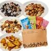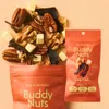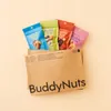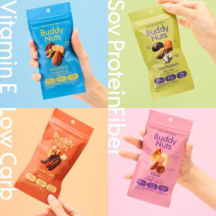 Original Assortは、BuddyNutsの魅力が詰まった商品です。色々な気分に合わせてお楽しみいただけるように、4種類すべてのBuddyNutsを詰め合わせました。初めてお召し上がりになる方やギフトにおすすめの商品です! 【VitaminE】 1袋に3.2mgのビタミンEを含み、1日の摂取目安量の51%* がとれる「Vitamin E」。ビタミンEをたっぷり含むアーモンドを中心に、香ばしいピスタチオ、爽やかな甘さのサンマスカットレーズン、沖縄県産の雪塩黒糖でしっとりと包み込んだカシューナッツをミックス。うるおいある時間を過ごしたいあなたにおすすめです。 * 栄養素等表示基準値(18歳以上、基準熱量2200kcal)に示されるビタミンE6.3mgに対する割合 アーモンド(アメリカ) 「地中海性気候」ならではの乾燥と降り注ぐ太陽の光に恵まれたカルフォルニア産の厳選したアーモンドを使用しています。 雪塩黒糖カシューナッツ(沖縄) 香ばしく素煎りしたカシューナッツに、沖縄県多良間島の黒糖を丁寧にコーティング。宮古島の雪塩がさらに甘みを引き立てます。 ピスタチオ(イラン) イラン産のピスタチオは雨の少ない砂漠の地域で育つため、濃縮したようなコクと深い旨み、そしてカリっとした食感が特徴です。 サンマスカットレーズン(オーストラリア) 有機栽培されたマスカット種を使用した無添加・ノンオイルのレーズン。マスカットならではの爽やかでクセのない甘味が特徴です。 【SoyProtein】 卵の1.4倍のタンパク質 * と大豆イソフラボン45.6mgを補給できる「Soy Protein」。丁寧に炒った北海道産の黒大豆は、愛媛県産のみかん蜂蜜でコーティング。半量は素のままでお楽しみ頂けます。滑らかでコクのあるピスタチオとジューシーな甘さのいちじくがアクセントとなり、安らぎの時間を演出します。ゆとりあるおやつ時間を楽しみたいあなたにおすすめです。 * 鶏卵1個(50g・全卵・生)のタンパク質量と比較 出典:日本食品標準成分表(八訂)増補2023年 蜂蜜黒大豆(北海道) 特殊製法で焙煎したサクサク食感の黒大豆に、愛媛県産みかん蜂蜜を丁寧にコーティング。ほど良く煎った黒大豆の香ばしさにマッチしています。 黒大豆(北海道) 煎り豆の香ばしさとカリッとした食感は、おやつやおつまみにぴったり。黒大豆特有の味わいをお楽しみください。 ピスタチオ(イラン) 濃厚なコクと深い旨み、そしてカリっとした食感が特徴のイラン産のピスタチオ使用しています。 イチジク(トルコ) 木の上で完熟させ、そのまま乾燥させて収穫するため、果実の全てが凝縮された無添加イチジク。種のプチプチ食感が楽しい独特の歯ごたえです。 【LowCarb】 チョコレートに比べて糖質80%オフ* した「Low Carb」。ナッツの中でも低糖質なピーカンナッツとクルミに、サクッとした食感のドライチェダーチーズ、パリッと食べてほのかな甘さが広がる北海道産昆布をミックス。エネルギーはしっかりとれるので食べ応えがあり、罪悪感ゼロでおやつ時間を楽しみたいあなたにおすすめです。 * ミルクチョコレート30g の糖質量と比較 出典:日本食品標準成分表(八訂)増補2023年 ピーカンナッツ(アメリカ) 渋みが少なく、甘みとコクが楽しめるピーカンナッツ。ビタミン・ミネラルや食物繊維、良質な油がたっぷり含まれる嬉しいナッツです。 クルミ(アメリカ) 世界で最も厳しいといわれる徹底した品質管理のもと生産されるアメリカ・カリフォルニア産の大粒クルミを使用。 ドライチェダーチーズ(オーストラリア) 無添加チェダーチーズをフリーズドライ製法でサクサクに仕上げました。コクのある濃厚な味わいが広がる新食感チーズです。 パリパリ昆布(北海道) 北海道道東沖で採れる新鮮な昆布を使用。鰹・椎茸などの独自の出汁でじっくり味付けした後、焼きを入れて香ばしさを加えました。 【Fiber】 1 袋に食物繊維2.7gを含み、1日に不足している食物繊維* を補える「Fiber」。砂糖不使用のドライパイナップルのジューシーな甘味とスーパーフード・ゴールデンベリーのさわやかな酸味、ドライフルーツの味を引き立てるカシューナッツと職人がローストした香ばしいアーモンドが絶妙にマリアージュ。それぞれに特徴のある味わいでリフレッシュできるので、スッキリ過ごしたいあなたにおすすめです。 *30,40,50代女性の食物繊維摂取目標量に対する不足分を算出 出典:日本人の食事摂取基準(2025年版)、令和5年国民健康・栄養調査 アーモンド(アメリカ) 「地中海性気候」ならではの乾燥と降り注ぐ太陽の光に恵まれたカルフォルニア産の厳選したアーモンドを使用しています。 カシューナッツ(アメリカ) 無塩無油でローストした素焼きのカシューナッツです。外はカリッと、中はふわっと優しい食感。ミルクのような風味と甘みを味わえます。 ゴールデンベリー(ペルー) 原産地でもあるペルー産のゴールデンベリーを無添加でドライフルーツに仕上げました。スッキリとした酸味と程よい甘みが特徴です。 パイナップル(コスタリカ) 高級産地コスタリカのパイナップルを砂糖を一切使