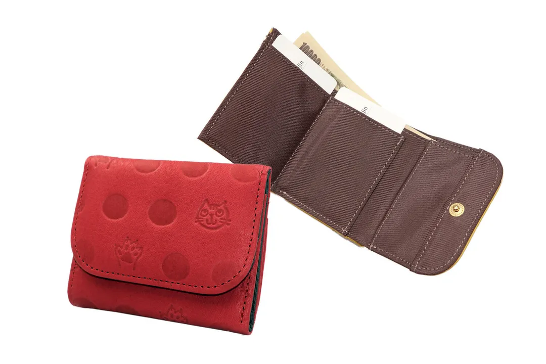 お札・小銭・カードを全部纏めて手の平サイズに!猫と肉球の牛革手乗りコンパクト財布・日本製 レッド