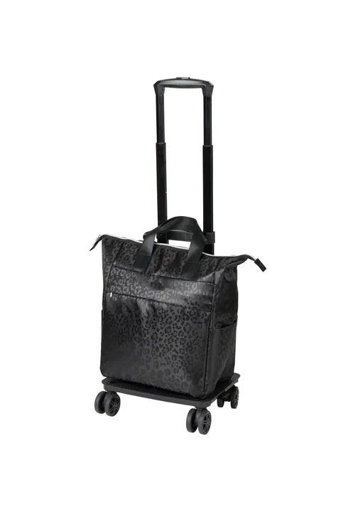 ・落ち着いたカラーで服装を選ばないシックなレオパード柄。 ・カートとしてもバッグとしても使える2WAY仕様 ・ストッパー付きのダブルホイールで安定した走行が可能 ・4段階調節可能なハンドル。 ・コンパクトに収納できる折りたたみなフレーム。