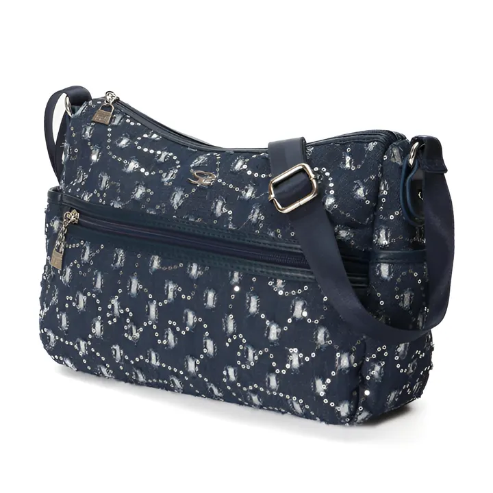 デニム素材のバックにスパンコールがとっても 可愛らしいバックです♪カジュアルなコーディネイトにピッタリです♪開口タイプ/ファスナー式■ポケット/(内側)ファスナー×1、オープン×2(外側)前ファスナー×1、両サイドオープン×各1