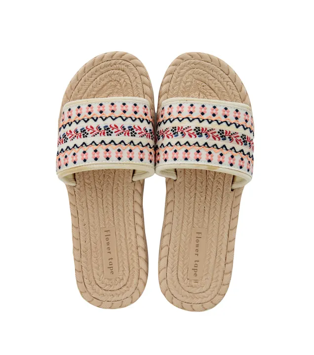 EVA樹脂製の軽量ソールを採用した、お手入れしやすい春夏定番スリッパです。 小花柄の刺繍がされた、チロリアン風の太フラワーテープをアッパーに。 白地ベースなのでとても涼しげで爽やかな印象です。