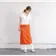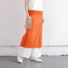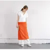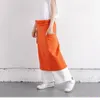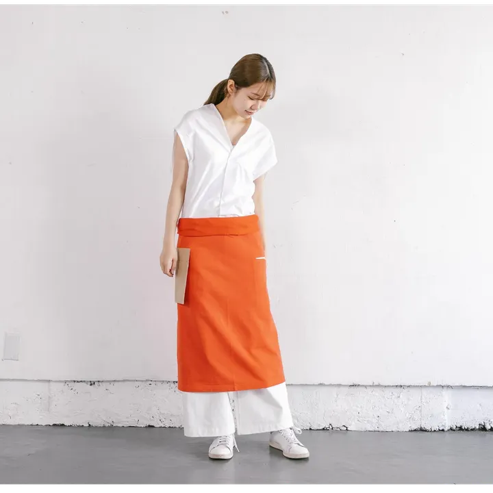 発色が美しいカットソーギャルソンエプロン オレンジ 形はひもを広げるとT字型  広幅のひもをウエストぐるりと巻いて、折り返します 折り返し部分にひもの重なったところを隠す感じです 折り返すことで、ひもはほどけません カットソーならではの特性を生かした結ばない工夫が新しい! もちろん結んでもOK! 着方、巻き方、自由です!! ひもの部分が長いので少々おなかの出ている男性でも大丈夫です 腰に巻いて ローウエストで身に着けるとグッと男前な感じになります ウエストサイズフリーの男女兼用 右に大きめのふらしポケット、左にシームレスポケット ポケットだって、左右一緒じゃなくても良い!自由なのです! ふらしポケットの生地はコルク色綿 ふらしポケットはからだから離れるので 中に入れたものが落ちない上に出し入れがスムーズです シームレスポケットにはトリコロールストライプカットソーを使っています ちらっとしか見えないところにもキュンとくるかわいさをプラスすることで、テンションアップに繋がればと願って!