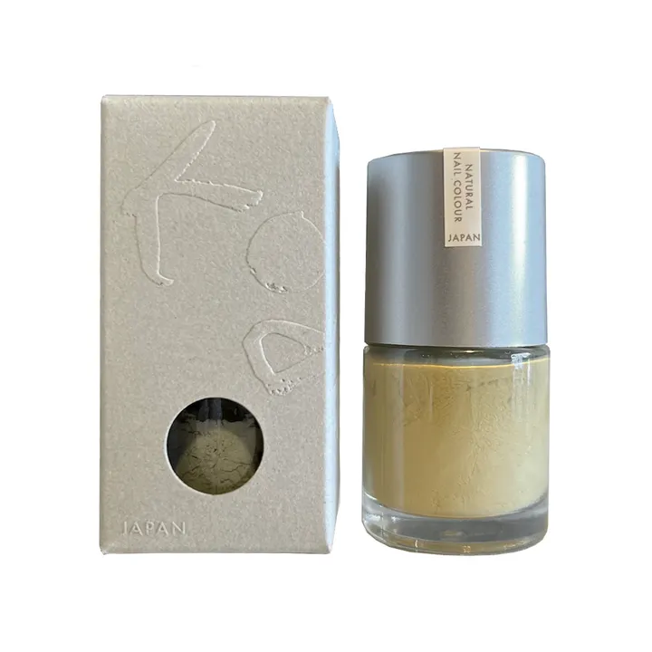 日本暮らしを彩る古代の色、土から取れるベンガラの色そのままをネイルにしました。 土そのものの色であるベンガラは肌にやさしいだけでなく、たとえば焼き物を作るときにかんじるような、 農作業で土をさわるときに感じるような、あったかい安心するような、癒しのエネルギーをもっていると言われています。 ベンガラは焼く温度(酸化)によって粒の形が変形し、その変化がさまざまな色をうみだします。 古くから日本画、能面、神社仏閣の壁画、天井画などの白色、または下塗り剤として使用されてきた胡粉(ホタテ貝殻の粉) を配合し、べんがらの色をより美しく引き立てるとともに、豊富に含むカルシウム、マグネシウム、亜鉛などのミネラルが 爪を保護、保湿し、美しく健康に保ちます。 原料はベンガラ、胡粉、天然ゴム、食品添加物である増粘剤とアクリル、ポリウレタンを使用した有機溶剤フリーの水性。 一部を除いて、ほとんどが天然素材というネイルの概念をくつがえす、安心安全、自然の美しさを生かしたネイルです。 通常のネイルに用いられる有機溶剤による強いにおいや、爪への負担もありません。 古代ネイルは内容成分の多くが安全な天然素材でできているため、通常のネイルと比較してとれやすくできています。 One Dayネイルとして、痛んだ爪をやすめるときや、お子様のネイルとして、またペディキュアにも適しています。 ネイルは専用のネイルリムーバーか、消毒用のエタノール75%以上のもので、コットンに含ませて落としてください。 除光液を使用することなくネイルを落とすことができますので、爪への負担を軽減します。 ・水性で自然素材でできていますので、ネイルをご使用の際は、爪表面の汚れや油分を落としてからハケに適量取って、のばすように塗ることで美しく仕上がります。 ・2度塗りするとさらにきれいに発色します。 ・マットな質感のため、トップコートを塗ることで艶が出て長持ちします。 ・べんがらの色をより長くおたのしみいただきたい方には、市販のトップコートの重ね塗りをおすすめいたします。 ・乾くまで一般的なネイルと同等の時間がかかります。 ・真珠貝の核(ボール状)がボトルの中に入っております。よく振ってからご使用ください。 ・お風呂などの水分によりネイル塗料が浮いてきますので、爪の根元からピーリングの要領で剥がすときれいに取れます。 ・エフェクト#01は大きな粒子のラメ、エフェクト#02は大きな粒子のラメのトップコートです。10色のカラーと組み合わせることで、異なる表情をお楽しみいただけます。 カラー原料:アクリル酸アルキルコポリマー・ポリウレタン-34・水・ホタテ貝殻の粉・酸化鉄(べんがら)・酸化チタン・ゴムラテックス・セルロースガム カラー:#ねずみどり