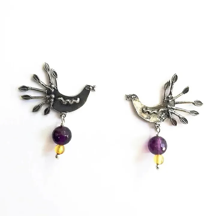 珍しいクジャクのモチーフにアメジストとアンバーを一粒あしらった スタッドピアス