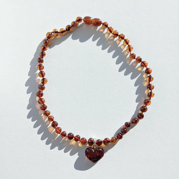 アンバーで出来たハートのペンダント♡他ではなかなか手に入らないデザインです。 ※ハートのペンダントの形状に個体差があります、ご了承の上ご購入下さい。 当店人気のCognacはヨーロッパでもアンバーネックレスの定番カラーとなっています。 ヨーロッパで古くから親しまれる、天然琥珀のベビーネックレス アンバーネックレスは、バルト海沿岸で採取される天然琥珀(アンバー)を使用したネックレスです。ヨーロッパでは古くから、赤ちゃんの健やかな成長を願うお守りとして親しまれてきました。 昔からヨーロッパでは、妊婦さんが安産のお守りとしてアンバーネックレスを身につける習慣がありました。 洗礼されたデザインと心地よい素材が楽しめるのもアンバーネックレスの特徴です。 【歯ぐずり時期の不快感をサポート】 アンバーには、コハク酸と呼ばれる成分が含まれています。このコハク酸が、赤ちゃんの歯固めの時期の不快感を和らげると言われています。 【大切な方へのプレゼントにも最適】 琥珀のプレゼントは「幸せを贈る」という意味を持つため、出産祝いや誕生日プレゼントにもおすすめです。 【赤ちゃんにも安心】 ビーズの間にすべて結び目が入っており、1ヵ所が切れてもバラバラに散らばることはありません。 アンバーネックレスの重さは、ネックレスのサイズによって異なりますが、一般的には約5~15グラム程度です。 アンバーは石ではなく樹脂なので、非常に軽量です。 そのため、赤ちゃんがつけていても負担になりません。 また、アンバーは温かみのある素材なので、赤ちゃんも安心感を感じられると言われています。 【熟練の職人による手作り】 現地の職人によって一つ一つ手作りされています。 手作りのため、同じデザインでも全く同じものは二つとありません。 世界に一つだけの、特別なベビーアンバーネックレスをお届けします。