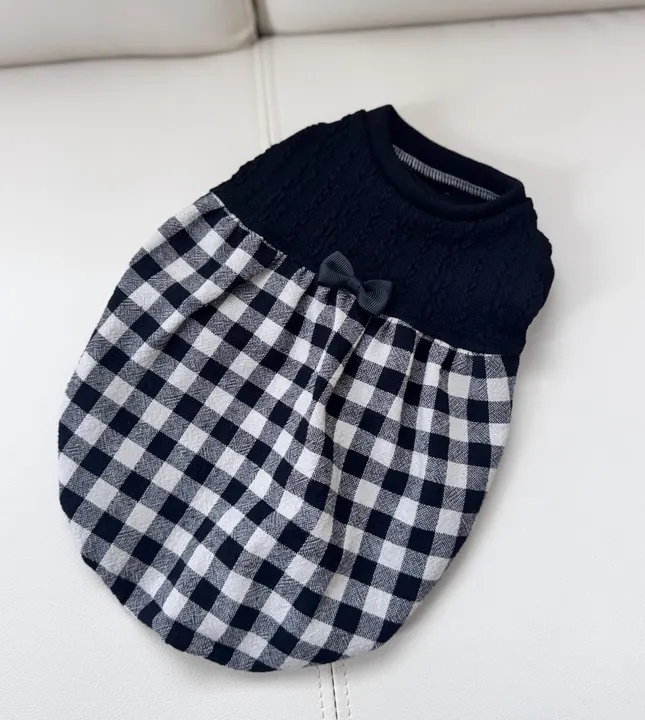 キンガムチェックが映えるシックな犬服です。アラン風ニットで落ち着いた質感を出しつつ、スカート部分に大きめのチェック柄を組み合わせ上品で存在感のあるデザインにしあげました。 ★綿麻ウォッシュチェック 綿の柔らかさと麻のしなやかさを折り合わせた上質素材。 ウォッシュ加工により、さらりとしたハリコシのなかにもふっくらした柔らかさを感じさせる微妙な風合いです。 ★アラン風ニット 程よい厚みと、ふんわり柔らかく伸縮性があります。