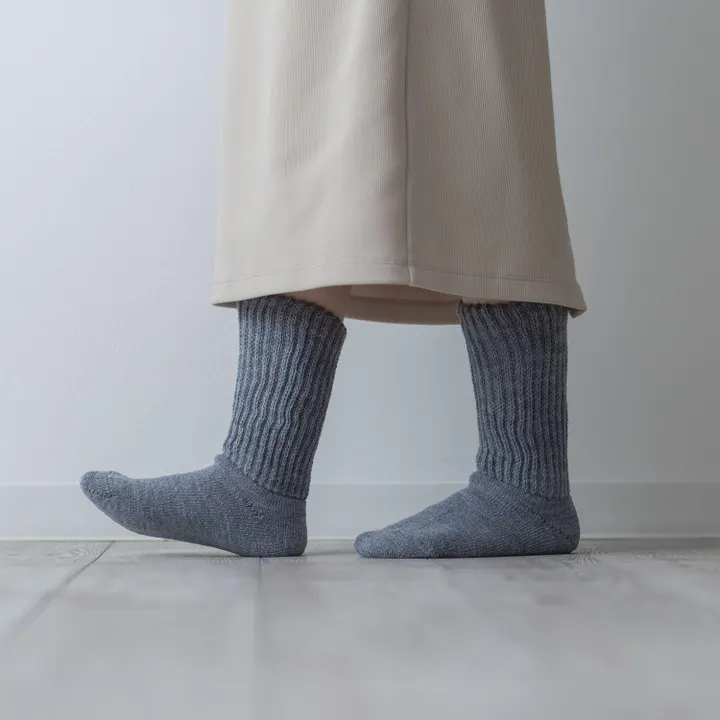 寒い日部屋で過ごすときには、足首のウォーマー部分を伸ばして、ふくらはぎまで包むことができ、カラダが温まったところで、二つ折り返にして履くことができます。 足首部分は内側部分に炭糸を使用して、二重編み仕様になっています。 「KinoKotoの炭糸」は、 消臭・調湿・遠赤外線機能のあるセラミック炭を使い、オーガニックコットンを染めた日本製の肌にやさしい糸です。 炭糸とコットンを均等に二重編みすることで、空気層をしっかり保ち、温かさを持続させます。