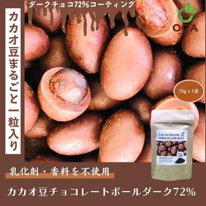 カカオ豆まるごと一粒入り: OCAの定番ダークチョコレート72%で香ばしく焙煎したカカオ豆を丸ごと一粒包んだチョコレートボール。 自社農園でカカオの栽培から加工までを一貫して行っているからこそできる、大胆なチョコレートボールができました。 一般的なFarm to Barのチョコレートメーカーは、カカオ豆を仕入れますが、私たちはカカオの木から栽培して、すぐ近くの工場でカカオ豆の加工からチョコレート作りまでを自分たちの手で行っているので、発酵・焙煎したばかりの新鮮なカカオ豆を扱うことができます。 新鮮なカカオ豆を贅沢にまるごと一粒使ったチョコレートボールは、Farm to Barのチョコレートを手掛ける私たちだからこそできる、特別なチョコレートボールです。 ビターxビター: コーヒーはブラック派、苦みに美味しさを感じるおとな舌のあなたにおすすめのチョコレートボールです。 甘いものが苦手な方にもぜひお試しいただきたい、甘くない、でもおいしいチョコレート。 ダークチョココーティング: チョコレートは生産地で加工するFarm to barチョコレート。カカオの香りを失わずにチョコレートに加工するので香料は使用していません。その他の添加物も一切不使用でカカオ本来のフルーティーな香り、そして酸味も感じていただけるチョコレートに、カリカリっと軽快に砕けるカカオ豆。カカオポリフェノールたっぷりのカカオが刺激的にあふれるチョコレートボールです。