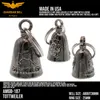 アメリカ製ガーディアンベル社製ガーディアンベルです。 MADE IN USA アメリカ製 交通安全 魔除け 御守り ガーディアンベル アメリカのライダーの間には、事故や、転倒の原因は「道路にひそむ悪魔」によるいたずらだという伝説があります。悪魔は走る者に悪戯やトラブルを運んできます。このベルは美しい音色で悪魔たちを追い払うと言われ愛されています。そんな悪魔のいたずらを防ぎ、御守りとなるのが、守護者のベルという意味を持つガーディアンベル。 日本でも鈴の音(ね)は神道では魔除けの音と言われています。ピューター製の鈴でいい音色でガーディアンベルはデザインも様々あります。 またガーディアンベルにまつわる伝説として、プレゼントとして送られたベルの効果は、自分で手に入れたものの2倍になると言われています。 それゆえに彼氏・彼女・友達・家族へのプレゼントとしての人気も非常に高まっています。 シルバーアクセサリーのようにおしゃれに装着できて素敵な音色を奏でるガーディアンベル。 バイカー以外にも自転車や旅・交通安全のお守りとしてお使いいただけます。 カバン・ランドセル・キーホルダー・ペットの首輪等に付けてお使いください!! ※タイラップ等でバイクのフレームにも簡単に取り付けできます。 アメリカンモデルだけではなく、旧車ファン、レプリカライダーまで、さらにバイクだけでなく、自転車や車にもピッタリな御守りとなっています。 アクセサリーとしても人気で、アイディア次第で車体だけでなく、キーホルダーや鞄など、どこにでも付けておしゃれに楽しめます。