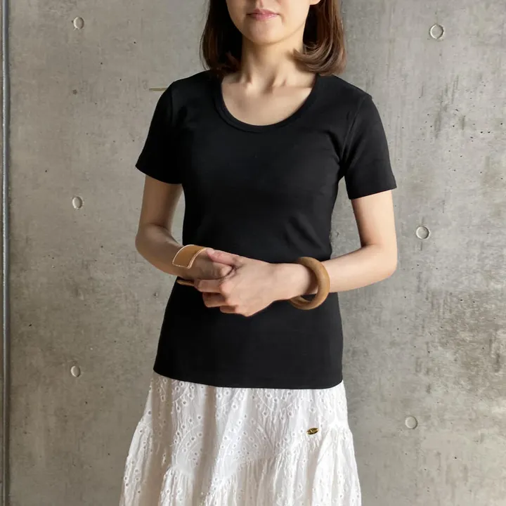 【日本製】丸銅コットンフライス_スクープネック半袖 ブラック 2-3サイズ