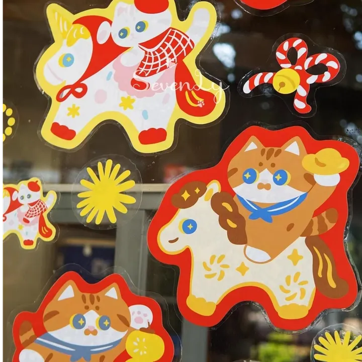 【2026春夏新作】午年 飾り 猫柄 ウィンドウシール 窓シール ステッカー『MEWJIミャオジ』☆インテリア シールセット(5枚纏め発注)