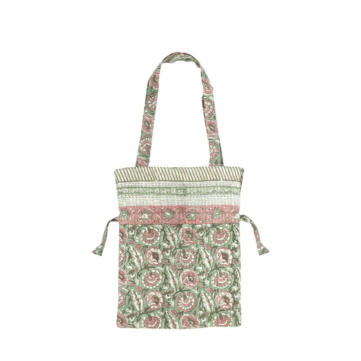 「心地よい」落ち着いた色調のブロックプリントシリーズ。 落ち着いた色合いのブロックプリントがおしゃれな巾着トート。 口を絞って小ぶりなバッグとして、絞らずに使えばA4サイズがすっぽりと収まります。 「ブロックプリント」はインドの伝統的な技法で、職人が木版を使い、一つ一つ手作業で生地にプリントを施した布です。