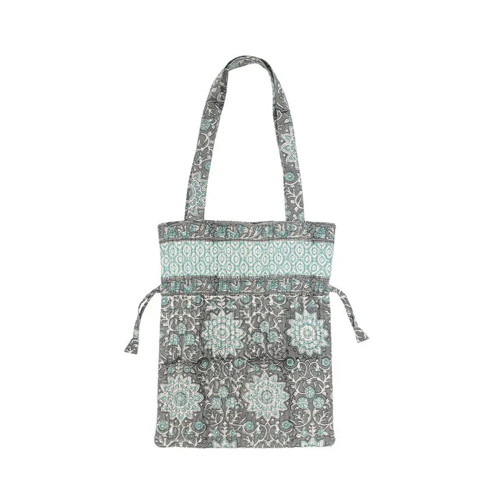 「心地よい」落ち着いた色調のブロックプリントシリーズ。 落ち着いた色合いのブロックプリントがおしゃれな巾着トート。 口を絞って小ぶりなバッグとして、絞らずに使えばA4サイズがすっぽりと収まります。 「ブロックプリント」はインドの伝統的な技法で、職人が木版を使い、一つ一つ手作業で生地にプリントを施した布です。