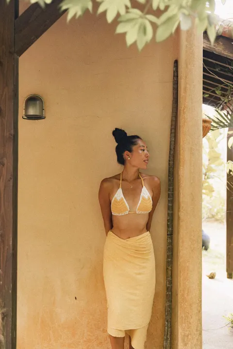品名:Your Style Skirt 1.8mと大判の為、ビーチマットして使って頂く際もはみ出すことなく心地 よく寝転んでいただける大きさにこだわりました。海でゆっくり寝転がり、 海上がりには体を拭き、サッと腰に巻くとパレオとしても使えます。コットン素材の為、濡れた後も乾きやすくなっています。秋や冬 にはブランケットやストールとして、男性の方でしたらターバンとしてもご利用いただいており、名前の通りあなたのスタイルに合わせて自由に使っていただけます。 特徴1 GOTS認証済みのオーガニックコットン生地をベンガラ(土)で染め、自然素材だけにこだわり、 使い古した洋服は土に埋めてもらうと地球に還る、地球循環型のお洋服です。 特徴2 どの型の洋服も2way~4wayで着ていただけるようデザインを工夫しており 1着あれば様々なコーディネートを楽しんでもらえます。 特徴3 お客様が普段お持ちのインナーを活用できるコーディネートをご提案することで サマーシーズンのみならず、春秋冬でもご愛用頂いています。 特徴4 GOTS認証済みのオーガニックコットン素材を使った高島ちち"みの生地は 使えば使うほどに柔らかくなりその人の肌に馴染むことが特徴で、お肌の弱い方にも 安心して着用いただいています。 特徴5 高島ちち"みは伸縮性のある生地の為、着れば着るほどに自分自身の身体に フィットしたサイズになってくれます。お客様からもこのようなお声を沢山頂いており、 フリーサイズ 展開でも生地の特徴を活かしそれぞれの体型に合わせた唯一無二の お洋服となっています。