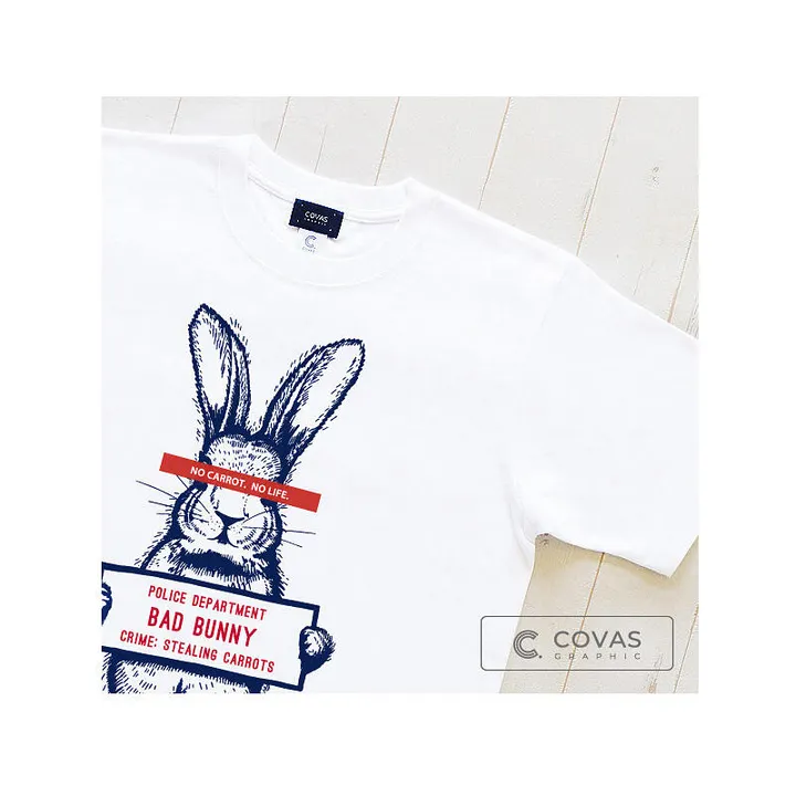 ”ラビット容疑者” ウサギ君、警察に逮捕されちゃいました。 外国の映像でよく見る罪状を書いたボードを持たされています。 ウサギはニンジン無しでは生きていけないんだぞ♪ 綿100% 6.2オンス・ヘビーウエイト天竺生地・コーマ糸使用 プリント方法:ダイレクトインクジェットプリント ★ワンランク上の品質★ ホワイトTシャツは透け感や肌着っぽさを無くするために、 他社でよくある5.6オンスのヘビーウエイト生地ではなく、 ワンランク上の高品質でしっかりした6.2オンス・コーマ糸生地を使用。 衿リブは洗濯を繰り返しても伸びないしっかりした作りになっています。 【XS】 身丈56 身幅42 肩幅38 袖丈15cm  女性小さめ 【S】 身丈62 身幅46 肩幅42 袖丈18cm  女性標準〜大きめ、男性小さめ 【M】 身丈67 身幅51 肩幅47 袖丈21cm  男性標準 【L】 身丈70 身幅55 肩幅50 袖丈22cm  男性大きめ 【XL】 身丈73 身幅58 肩幅54 袖丈23cm  男性特大 ※サイズ表記はメンズサイズの表記になっています。 商品キーワード: ウサギ 兎 ラビット うさぎTシャツ ラビットTシャツ コメディTシャツ  Tシャツ Tシャツ ティーシャツ メンズ レディース メンズTシャツ レディースTシャツ 大人 ユニセックス 男女兼用 男性 女性 トップス カットソー 半袖カットソー 半袖Tシャツ 半袖T 半袖 カジュアル プレゼント 父の日 クルーネック デザイン デザインTシャツ イラスト イラストTシャツ グラフィック グラフィックTシャツ プリント プリントTシャツ 綿 コットン 綿100% ヘビーウエイト 雑貨店 厚手 人気 おすすめ 数量限定 XS SS LL XL Tシャツブランド コバス コバスグラフィック COVAS GRAPHIC COVASGRAPHIC