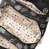 デニム地に花模様をプリントしたバッグ。花柄プリントのラメがきらき開口タイプ/ファスナー式■ポケット/(内側)ファスナー×1、オープン×1(外側)前後ファスナー×各1らと華やかな印象に!