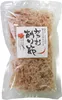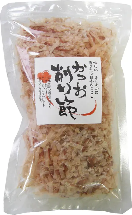 ーーー 【送料に関して】 商品合計が「60袋以上」もしくは「2ケース以上」で送料は弊社負担となります。(北海道・沖縄は除く) ーーー 鹿児島県産のかつお荒本節を料理にのせて食べやすいよう極薄く細く帯状に削ったかつお削り節です。 少しつまんでひねれば 、とっても綺麗な鰹のトッピングができます。 お出汁にもお料理にのせてもお使いやすくなっています。 同じ細削りでも「本枯節」を使っているものよりも当商品のように「荒本節」を使っているものの方が安価になります。 それは「原材料の価格」と「削ったとき出る粉の量(歩留まり)」により価格差あるからです。 【細削りって何?】 かつお節を薄く細く削っているので、弊社では「細削り」と名付けて読んでいます。 一般的には糸削りの一種類として定義されます。 カネジョウでは昭和57年から作る続けているロングセラーとなっています。 当時、かつお削り節といえば幅広く削った通称「花かつお」しかありませんでした。 ですがそのまま食べるには上顎についたりと食べ辛いものです。 そのため、当時はカンナの研磨からすべて自社で行っていた二代目 望月庫次と三代目 望月啓一が「もっと食べやすいかつお削り節を作れないものか?」と考えて生み出したのが、この「かつお細削り」です。 今ではカネジョウのかつお削り節=かつお細削りという代名詞になっています。 【オススメの用途は?】 先述のとおり、お料理などのトッピングにしやすい形状です。 ご飯にかけたり、サラダにかけたり、おうどんにかけたり・・・。 リンゴや桃にかけて、オリーブオイルと塩コショウをふりかけて食べるのもとっても美味しい食べ方です。 【実はダシにもオススメ!】 ダシにするには一般的に幅広(花かつお)を選ばれる方が多いです。 ですけど実は、細削りの方が短い時間でダシも出やすいんです! 削り節はお湯との接地面積が広い方がダシがでます。 細削り幅広と比べてはカットしている分だけ接地面積が広いんですね。 ですのでダシの出方もスピードも細削りの方が早いです。 もちろん、出汁ガラは乾燥させた後、細かく刻んでふりかけにしたり、自然肥料としてもお使い頂けます。 煮出して取るのが面倒な方は、お椀に入れてお湯をかけるだけでもOK。 一緒に昆布やワカメを入れたり、味付けにお醤油やお塩、お味噌を入れれば簡単にプラス1椀が出来上がります。 【使用原料に関して】 鹿児島県で水揚げされた貴重な近海産のかつお荒本節を使用しています。 かつお荒本節は、一般的に使われている荒節よりも大きなサイズのカツオを使用しています。 その分、芯まで燻製が効きすぎることなく、さらにカツオの味がしっかりしています。 【かつお節の発酵は普通の発酵とちょっと違う!?】 一般的に発酵食品というと何をイメージしますか? お醤油、お味噌、お酒、チーズなどいろいろありますよね。 そしてどの食品も発酵させることにより「旨味が醸成されて強くなる」「香りや風味も強くなる」という何かが足されるプラスの変化が起こると思われる方が多いのではないでしょうか? しかし鰹節は違うんです。 発酵という作用により、香りや旨味の一種である雑味を削ぎ落としていく「引くという変化」が生み出されているのです。 このような発行により洗練させるというのは他ではなかなか聞きませんし、とても日本的だなっと思います。 ちなみに、もともと枯節を作る方法は偶然に見つけられたものです。 この方法が発見された江戸時代の当初は、カビの作用により鰹節内の水分を抜くことによる運送中の品質管理の簡便さと長期保管を主な目的として行われてきました。 今では「本枯節が最高」という言い方をするメーカーもありますが、弊社ではまったくそうは思いません。 もともと地域性のもとで選ばれてきた鰹節の種類ですし、料理によって向き不向きや人によって好きずきがあります。 料亭のお吸い物では上品さと透明さを求めて本枯節の血合い抜きが選ばれることもあるでしょう。 またはラーメン店などではよりガツンとしたインパクトが求めて、脂が多く燻製が強いものを求めることもあるでしょう。 お客様におかれましては、自分好みを見つけて頂くことも一つの食の楽しみでもあるかと思います。 「鰹節だったらこれ!」と思い込まず、いろいろなものをお試し頂けますとメーカー冥利につきます。 ●栄養成分(100g当り) 熱   量:340kcal タンパク質:78g 脂   質:3g 炭 水 化 物:0.8g 食塩相当量:1.12g