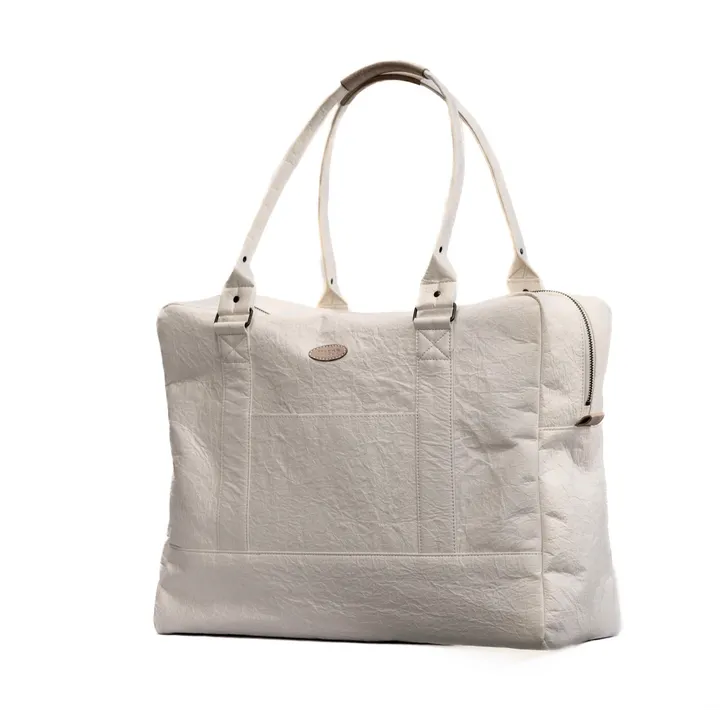 【和紙雑貨】トラベルバッグ 旅行用バッグ 旅行1泊2日 1泊2日程度の荷物を収納することが出来、背面のキャリーバー通しを使用すればキャリーバッグの上に乗せることが出来ます。 バッグ類は和紙ならではの軽さと風合いで、他とは被らない個性豊かな鞄です。 兵庫県多可町の特産品である杉原紙を表地、播州織を裏地に使用。裏地に使用することで丈夫になり、和紙特有の軽さを活かしています。 ロゴネームやハンドル部分などで使用している革も多可町で穫れた鹿の革を使用しています。 生産、素材ともに【made in japan】でものづくりを行っております。 杉原紙は100%自然由来の原料で出来ており、鹿革も獣害駆除で穫れた鹿の革のみを使用しています。 ある程度の重さに耐えられるような芯材選びや縫い方はこだわっています。