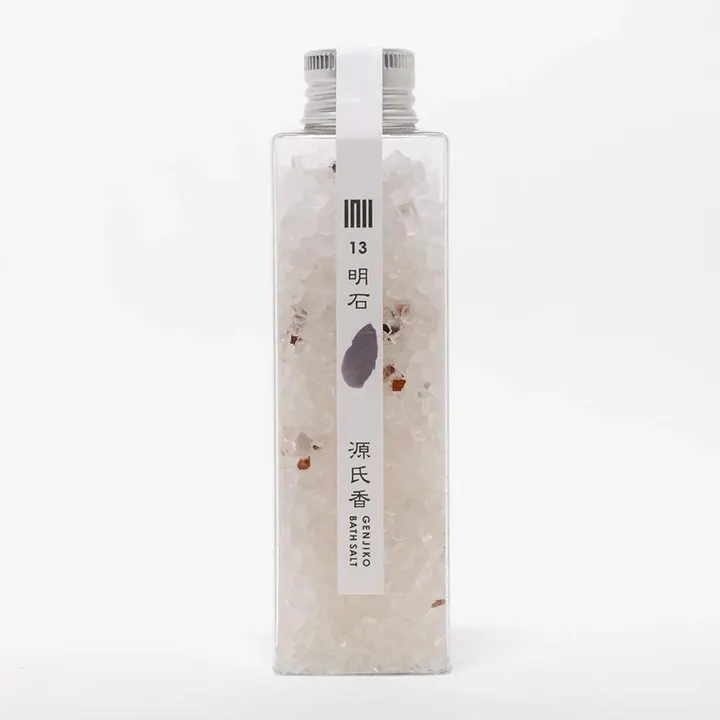 【源氏香アロマバスソルトシリーズ 〜源氏物語の5人の姫君をイメージした香り〜】 「源氏香」とは江戸時代に大流行した組香遊戯です。源氏香アロマバスソルトシリーズでは名付けの元となった「源氏物語」に登場する5人の姫君をイメージし、アロマバスソルトで表現しました。 【13 明石 NOBLE 高貴で奥深い香り】 明石は地方官職明石の入道の一人娘である明石の御方の事を指します。父は明石で得た財で彼女を大切に育て、彼女は光源氏が謹慎で明石に移った時に出逢いました。やがて源氏の娘を産み、その娘が後に第一皇子を生んで中宮に立后したことで国母の母という高貴な立場にまで登り詰めました。彼女は箏や琵琶の名手で音楽にとても秀でており、品と格式を重んじる気高く真面目な女性です。 商品特徴 天然ミネラルを豊富に含んだヒマラヤ岩塩とブレンド精油を使用。肌を引き締めキメを整える作用がある他、ゆっくり汗を排出する半身浴にもおすすめです。 ご使用方法 180gボトル:浴槽約180Lに対し本製品を20〜40g程度投入しよくかき混ぜてからご入浴下さい。 30g包:浴槽約180Lに対し1袋を投入して、よくかき混ぜてからご入浴下さい。 成分 塩化Na(ミネラル塩)、香料(ラベンダー/スイートオレンジ/パルマローザ/マージョラムスイート/クラリセージ)