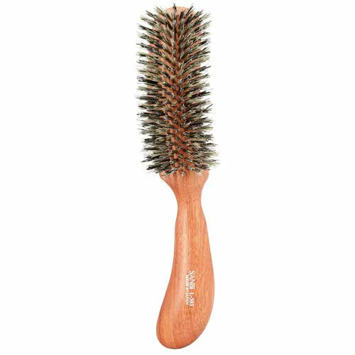 髪の細く柔らかい方、髪の量の少ない方向けのブラシ。 木の持ち柄で獣毛100%のヘアブラシは、髪には大敵の静電気を最も起こしにくい素材の組み合わせであり、(帯電列において髪の毛と獣毛は最も近い素材、木材はハンドルの原料となりえる髪の毛に最も近い素材であるため静電気が起こりにくい)過度なブラッシングによる髪の負担を軽減します。  かつての天然毛100%のブラシは、猪毛や黒豚毛等が使用され、硬く毛の細い方や毛量の少ない方には頭皮の刺激が強すぎるため、「細く柔らかい毛を密に植えたヘアブラシ」が適しています。  SANBIでは、柔らかい白豚毛と黒豚毛を独自の方法で調合し、ソフトなあたりのブラシを独自のノウハウで開発。このソフトなあたりは、70年以上ヘアブラシ製造を行ってきたからこそ可能となり、SANBI独自の植毛技術でつくられています。  天然木の持ち柄は、全面曲面の持ちやすさを追求した形状。 70年以上美容師向けのブラシを作り続けていたからこそできるブラシづくりのノウハウが詰まった商品です。 頭の形状に沿ったS字型のL-381 右利きにも左利きにも使いやすいI字型のL-351 シャンプー前のブラッシングや、お出かけ前の髪のセットにご使用ください。