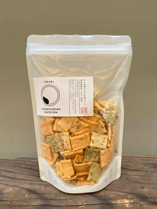 薄く削ったあられにぴったりのマヨネーズ ほんのりとした梅パウダーでクセになる味です 硬すぎずフワッと焼き上げており何枚でも召し上がっていただけます 海老、胡麻、青のりの三種類 ◆内容量 スタンドパック L 180g