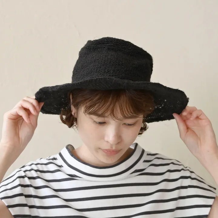 定番の人気ハット。今季はさりげなく光るワンポイントの真鍮の飾りを付けました。細編みで仕上げたハットは軽いかぶり心地。ブリムはワイヤー入りでお好みのシルエットに変形が可能です。