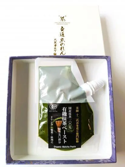 透明な小袋に詰められた有機抹茶ペーストが、京千代紙の箱に入っています。 サイズがコンパクトなので、ちょっとしたギフトに最適です。 この有機抹茶ペーストは、希少価値の高いオーガニック抹茶が使用されています。 無農薬・無化学肥料で栽培され、着色料や防腐剤も一切使用せずに、ペースト状に加工しました。 ノーシュガーで低カロリーなので、健康を気遣いながら楽しめます。 毎日抹茶を飲みたいけれど、茶筅で溶かすのが手間だと感じる方にもおすすめです。 水と一緒に振るだけで簡単に抹茶が楽しめ、健康的な生活をサポートします。 マイボトルに水と共に入れると簡単に抹茶ドリンクができます。 お湯に混ぜるだけで、ホット抹茶ティが!抹茶ラテもミルクに混ぜるだけ! 忙しい朝やリラックスしたい時にも、ぴったりのアイテムと言えるでしょう。 また、加熱しても緑色を保持し、粉ふるいも不要なので、抹茶焼き菓子や抹茶パンケーキづくりのお役に立てます。