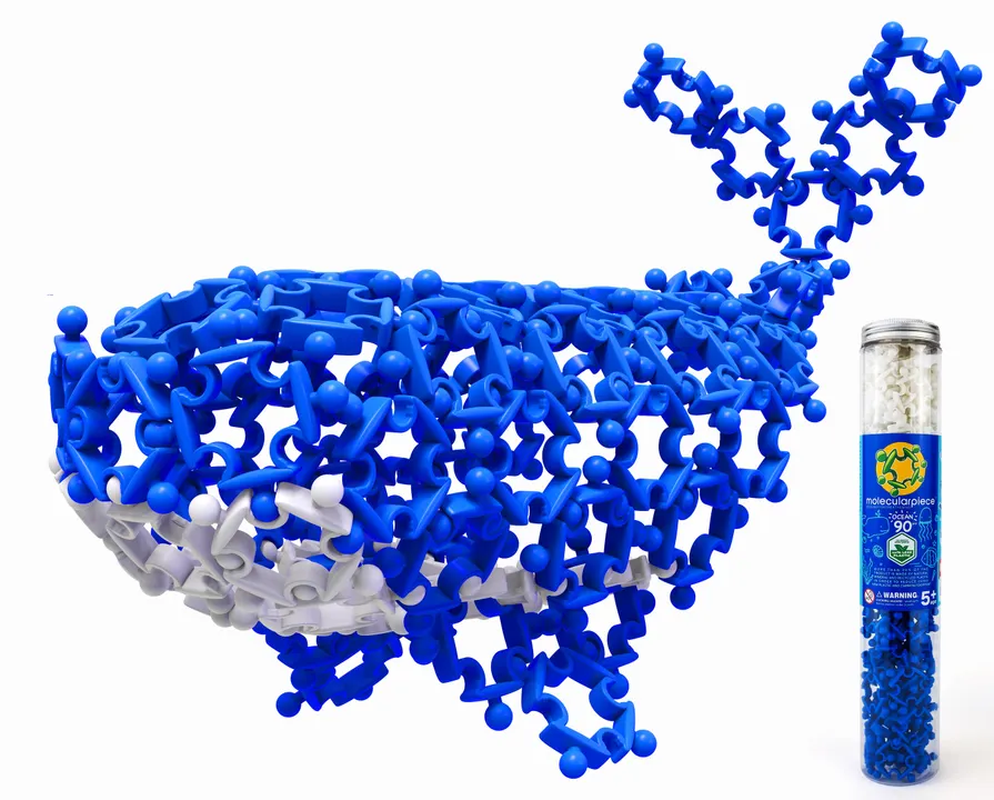 分子の形からできたアメリカの知育ブロック「モレキュラーピース」 海の生き物が作れるセットです。 繋げて、捻って、曲げて、丸めて自由に形が作れるブロック。 天然ミネラルと再生樹脂を使用してプラスチックを20%削減した環境にも優しい玩具。 海(クジラ) 90ピース入り(青・白の2色入り) 取説付き 対象年齢:6歳以上
