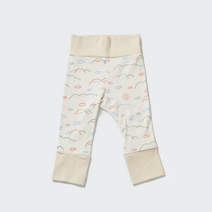 カラフルな山々と太陽や雨を降らす雲のイラストが目を引くリブレギンス -素材の特徴- 地球とヒトにやさしいオーガニックコットンを使用 柔らかなリブ素材は体に優しくフィットし動きやすさも肌触りも抜群です。 -デザインの特徴- アジャスタブル仕様 ウェスト部分の幅も少し広めにとることで、サイズの調整だけでなく、伸ばして腹巻きのように使用することでお腹を冷えから守ります。 裾部分を少し長めにとったデザインは赤ちゃんの成長に合わせて折り返して調整ができ、0~1歳頃まで長くご着用いただけます。 -ポイント- デザインから生産まで全て日本で作られている'All made in Japan' 職人さんが手作業で印刷を施す’手捺染(てなっせん)’という印刷技法を採用。 機械では出せない色味ややさしい雰囲気に仕上がっています。