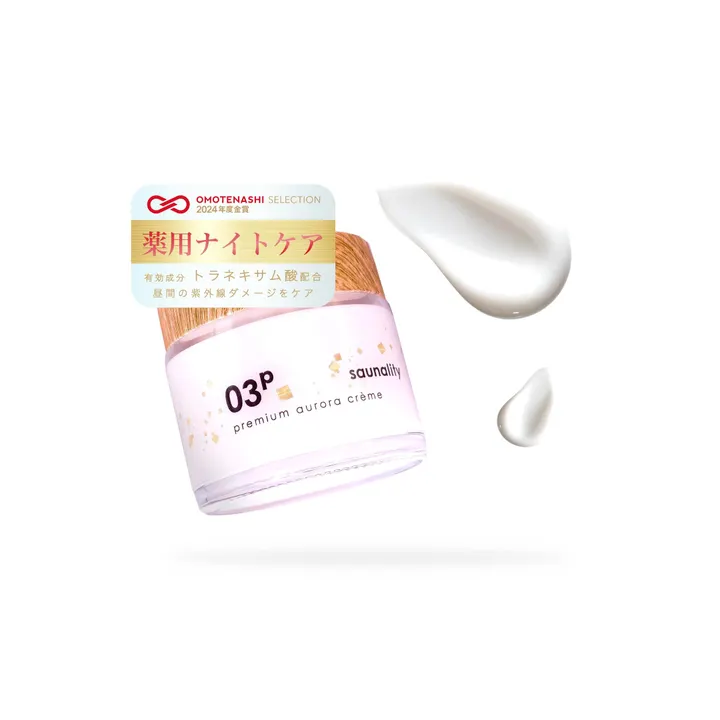 「もっと」を叶える。オーロラをまとったような透明感へ。 03p プレミアムオーロラクリームは、お肌を柔らかくととのえて、キラリとしたもっちり透明肌へ導くハイエンド美白*1クリームです。 こだわりの薬用美白*1成分「トラネキサム酸」が、シミ・くすみの原因となるメラニンの生成を徹底ブロック。 メラノサイトを活性化させる「プラスミン」の働きを抑制するためシミの原因となるメラニン色素の生成を抑えることが出来ます。 生薬の甘草から抽出される有効成分「グリチルレチン酸ステアリル」が、クリームの油分による肌表面の油膜に弾かれることなく肌まで通過し*2、抗炎症効果を発揮します。肌荒れやニキビを予防します。 さらに、植物性スクワラン(保湿)、オリーブ油(保湿)を配合しています。 誰もが羨む、オーロラをまとったような透明感へ導きます。*3 ぷるんとした濃密な使用感が特徴です。 *1 メラニンの生成を抑え、しみ、そばかすを防ぐ。 *2 角質層まで。 *3 使用感のこと。